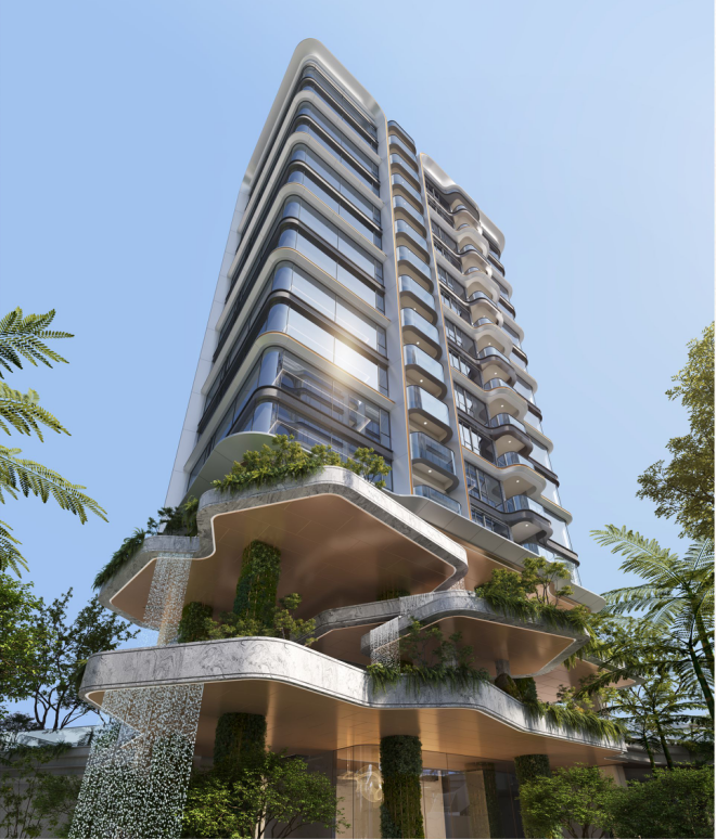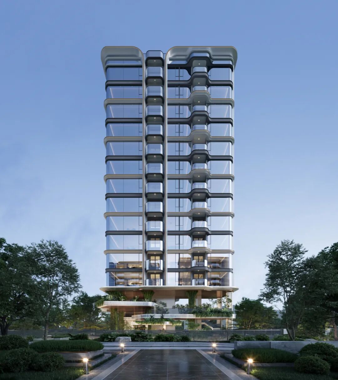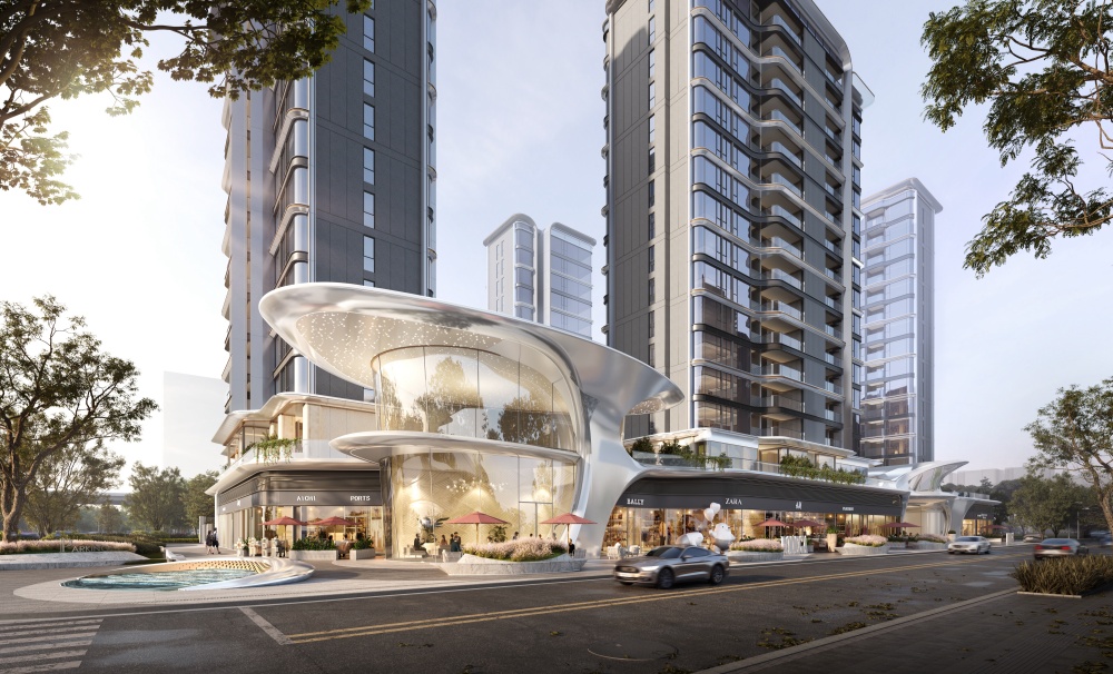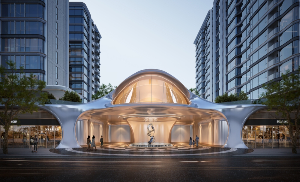 项目采用70年抗衰钛晶级铝板、陶瓷板、玻璃三重材质,以“镜立方”悬浮玻璃客厅和“天空玻璃花树”为灵感,打造无边际流动月华建筑立面,让建筑与光影共生。