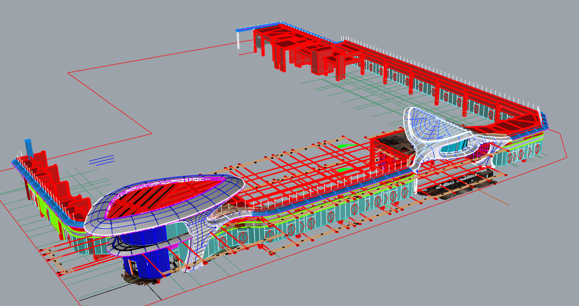 主要幕墙类型有双曲蜂窝铝板、70宽竖明横隐玻璃幕墙、70宽竖明横隐精致钢玻璃幕墙、铝板格栅幕墙、玻璃栏板、30mm厚花岗岩石材幕墙、3mm穿孔铝板等。