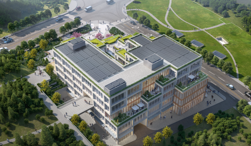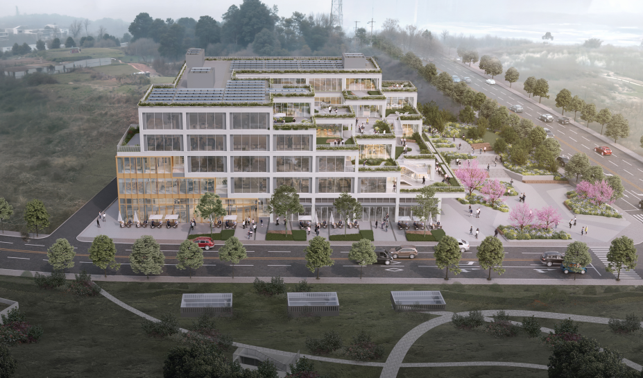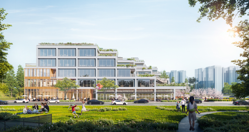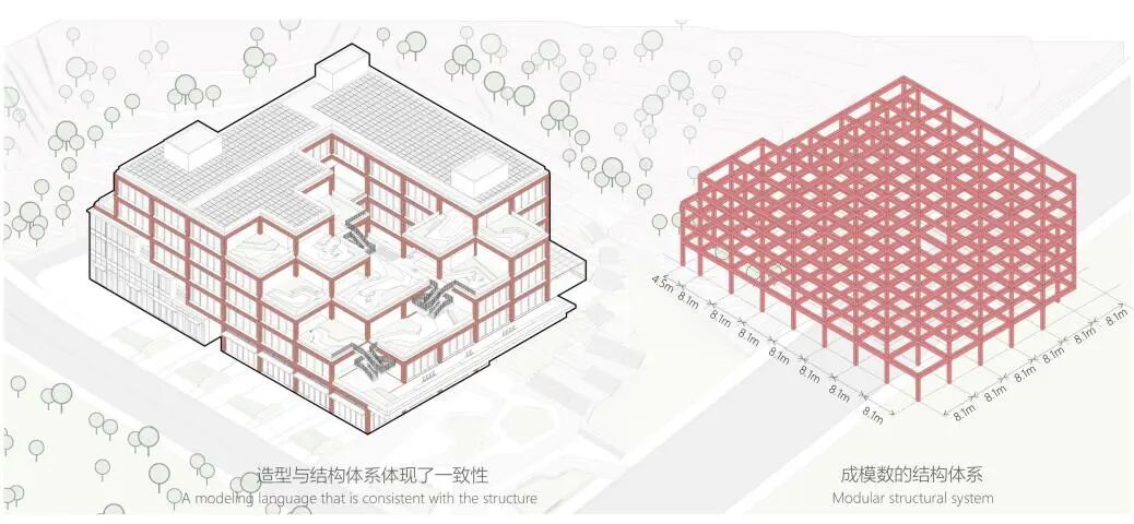 设计团队将结构梁柱直接外露,形成建筑立面框架,玻璃窗镶嵌其中,清晰展现结构构成逻辑。在结构外侧,采用清水混凝土质感涂料,减少装饰层,构建出既实用又低成本的建筑外围护系统。以柱网模数为基准,精准控制建筑整体形态,屋顶退台与结构柱网模数完全契合,如同用标准方形积木精心搭建,简洁而富有秩序感。项目主要幕墙类型有:竖明横隐玻璃幕墙,铝板幕墙、铝板百叶、铝板雨棚等。